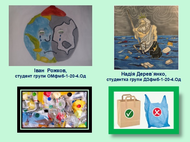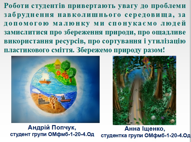 В своїх роботах вони піднімали болючі питання забруднення навколишнього середовища. Малюнки студентів спонукають глядачів замислитися над питаннями збереження навколишнього середовища, розумного використання надбання технічного прогресу, виконувати правила щодо утилізації побутових відходів, зокрема - пластикового сміття.
