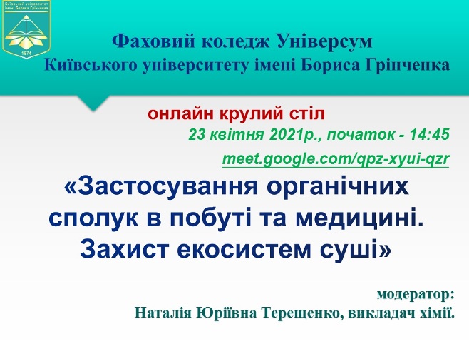 23 квітня 2021 року у Фаховому коледжі «Універсум» Київського університету імені Бориса Грінченка в рамках заходів з нагоди Дня коледжу відбувся круглий стіл «Застосування органічних сполук в побуті та медицині. Захист екосистем суші».