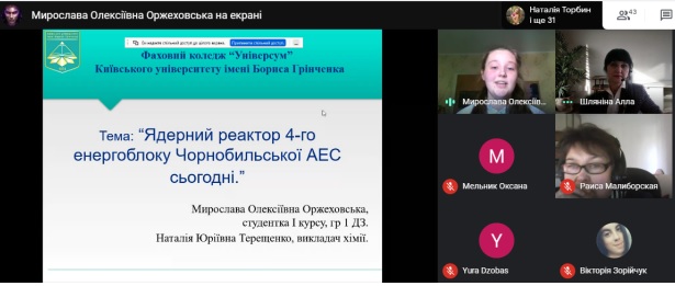 Від циклової комісії природничих дисциплін Фахового коледжу «Універсум» Київського університету імені Бориса Грінченка брали участь студентка ІІІ курсу спеціальності Початкова освіта Юлія Сніцаренко (тема доповіді «Чорнобиль сьогодні», науковий керівник Л. М. Глухенька) та студентка І курсу спеціальності Дизайн Мирослава Оржеховська (тема доповіді «Ядерний реактор 4-го енергоблоку АЕС сьогодні», науковий керівник к.х.н. Н. Ю Терещенко).