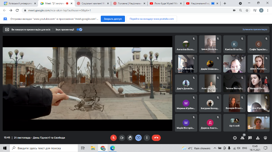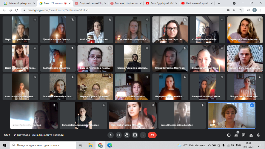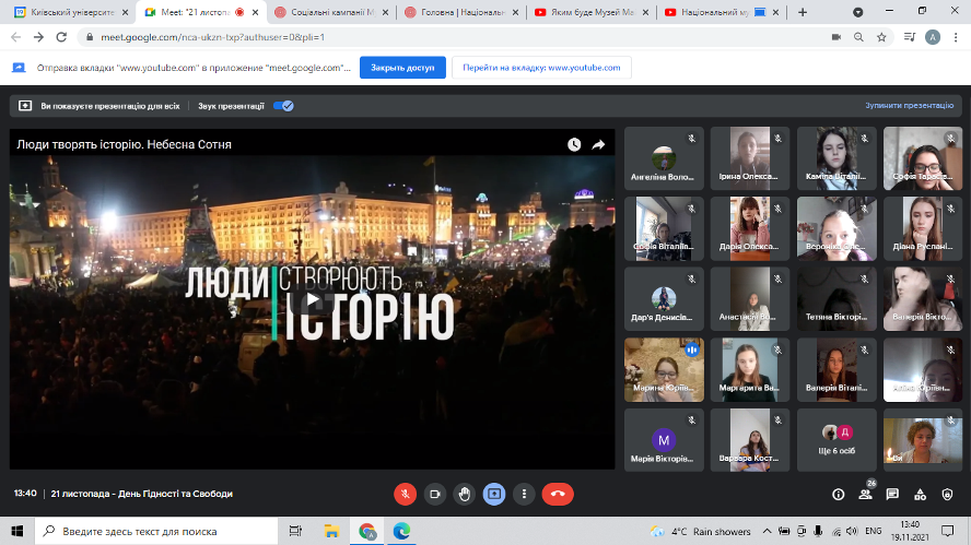 19.11.2021 року у Фаховому коледжі «Універсум» Київського університету імені Бориса Грінченка для студентів І курсу групи ПОфм-2-21-4.0д було проведено онлайн-подорож до Національного музею Революції гідності https://maidanmuseum.org/uk,, приурочену до Дня Гідності та Свободи.