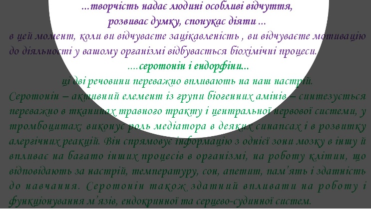 Учасники заходу, студенти групи ОМфмб-1-21-4.0д, дізналися про біохімічні процеси та хімічні сполуки, що синтезуються в організмі людини під час різних видів діяльності. Процес успішного навчання та творча діяльність студентів розпочинається із відчуття внутрішньої мотивації, прагнення до результатів і готовності працювати, що продовжується в діяльності людини (формуванні системи знань, розвитку умінь). На прикладах різних об'єктів, створених людьми, студенти побачили важливість практикування творчого підходу, обґрунтованого системою наукових знань. Створення нового дизайну речей, покращення емоційного стану оточуючих за допомогою малюнків, елементів декору- все це супроводжується утворенням в організмі людини спеціальних хімічних речовин - гормонів щастя.