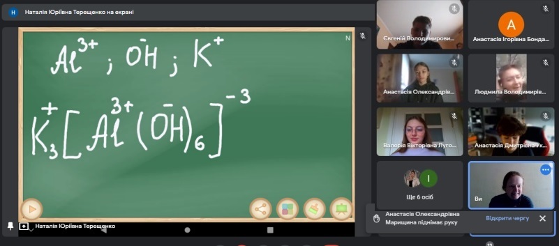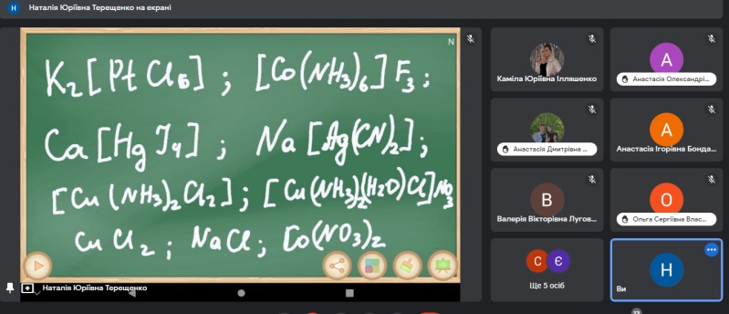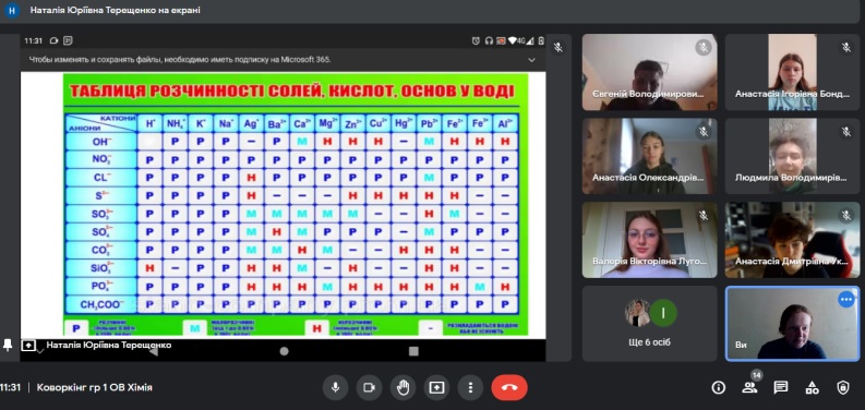 Учасники заходу, студенти групи ОВфмб-1-21-4.0д, активно співпрацювали в online середовищі, аналізу валикомпонентний склад хімічних сполук за допомогою таблиці розчинності солей. Пропонували реагенти та умови процесів утворення неорганічних солей в природному середовищі та в лабораторії. Окремими сполуками, розглянутими під час коворкінгу стали комплексні сполуки. Експертами у питаннях, побудови молекул різних видів комплексних солей виступили студентки групи 1 ОВ: Ольга Власенко, Анастасія Марищина, Анастасія Українська. Активно співпрацювали студентки Каміла Ілляшенко, Валерія Луговська. Під час коворкінгу студенти розглядали приклади комплексних сполук природного та синтетичного походження, зрозуміли та навчилися записувати формули солей, що містять комплексні катіони, комплексні аніони, створили нейтральні комплексні сполуки.