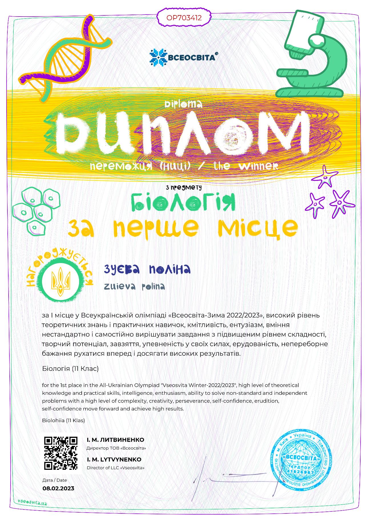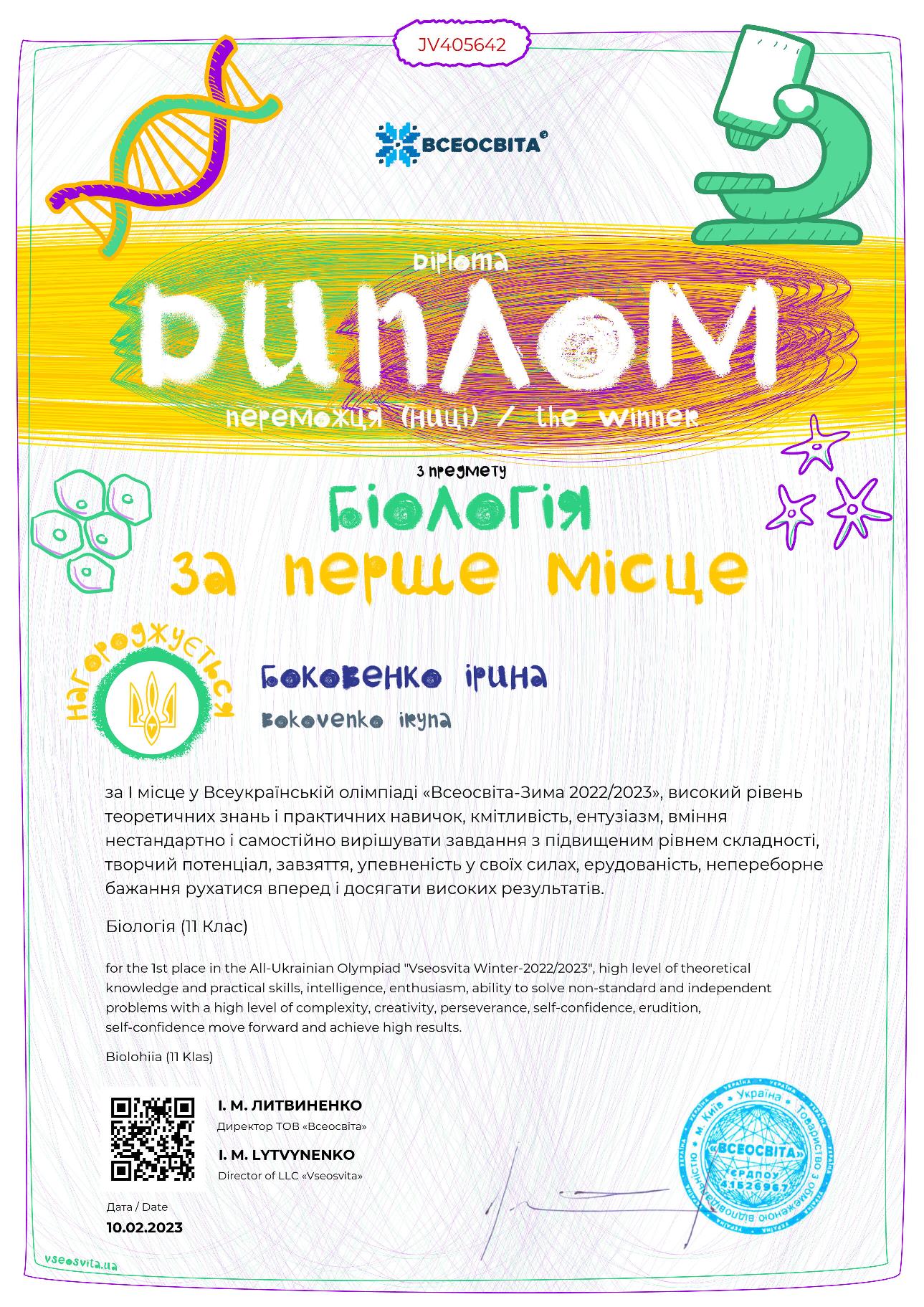 Вітаємо студентів Фахового коледжу «Універсум» Київського університету імені Бориса Грінченка, переможців Всеукраїнської онлайн олімпіади з біології «Всеосвіта- зима 2022/2023.