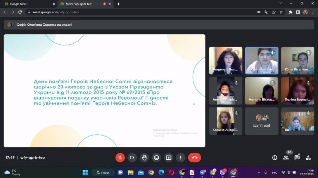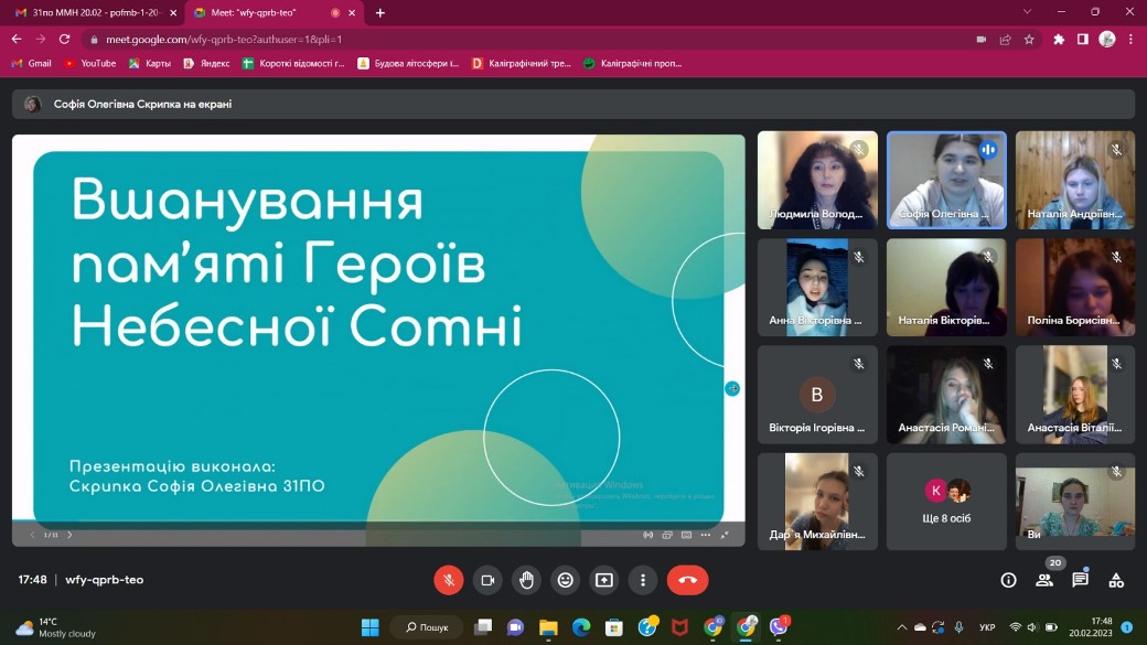 20.02.2023 у Фаховому коледжі «Універсум» Київського університету імені Бориса Грінченка в групі ПОфмб-1-20-4.0д відбулася виховна година «Небесна сотня. Герої, що змінили хід історії», присвячена Дню Гідності та Свободи.