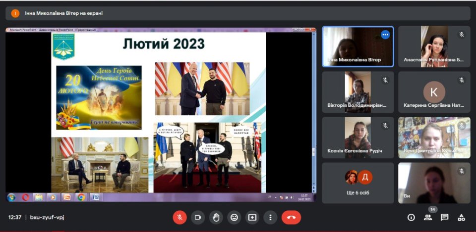 24.02.2023 року у Фаховому коледжі «Універсум» Київського університету імені Бориса Грінченка в групі ДОфмб-2-21-3.0д була проведена година спілкування, присвячена річниці повномасштабної війни росії проти України. На заході студенти мали можливість поділитися власними історіями про те, де і як застала їх війна; згадали кожний місяць цього важкого, мужнього, сміливого і незламного року для всіх українців; дійшли висновків, що попри все пережите за рік, українці не втрачають віри і впевнено заявляють: "Україна переможе. Ми переможемо!"