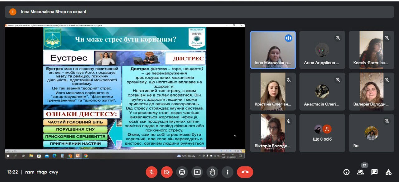 21 квітня 2023 року у Фаховому коледжі «Універсум» Київського університету імені Бориса Грінченка для студентів групи ДОфмб-2-21-3.0д в рамках декади ЦК природничих дисциплін з метою підтримки психологічного здоров’я студентів, відбувся методичний тренінг на тему: «Як допомогти собі у стресовій ситуації під час військового часу?».