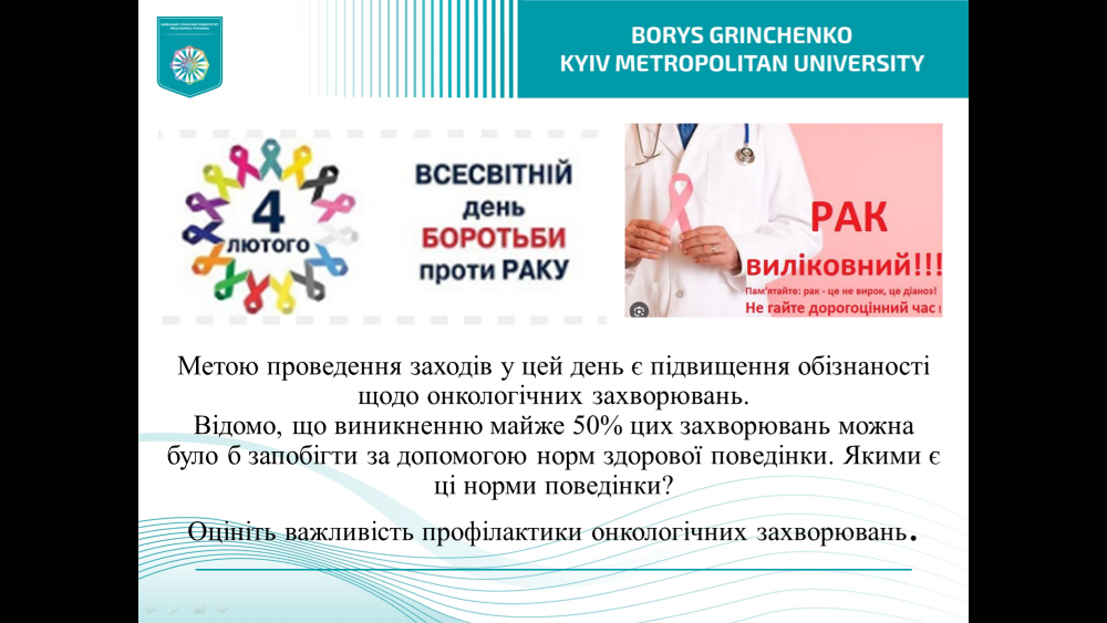 6-7 лютого 2024 року у Фаховому коледжі «Універсум» Київського столичного університету імені Бориса Грінченка для студентів груп ПРфмб-1-23-4.0д, ХОРфмб-1-23-4.0д, ММфбм-1-23-4.0д, та ПОфмб-1-23-3.0д була проведена інтерактивна лекція присвячена «Всесвітньому дню боротьби проти раку» (World Cancer Day).