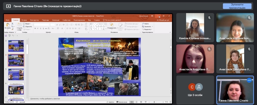 Студенти переглянули презентацію, відео-стрічки «Пам`яті Небесної Сотні», «ЗИМА, що нас змінила», присвячені подіям 2013-2014 рр.