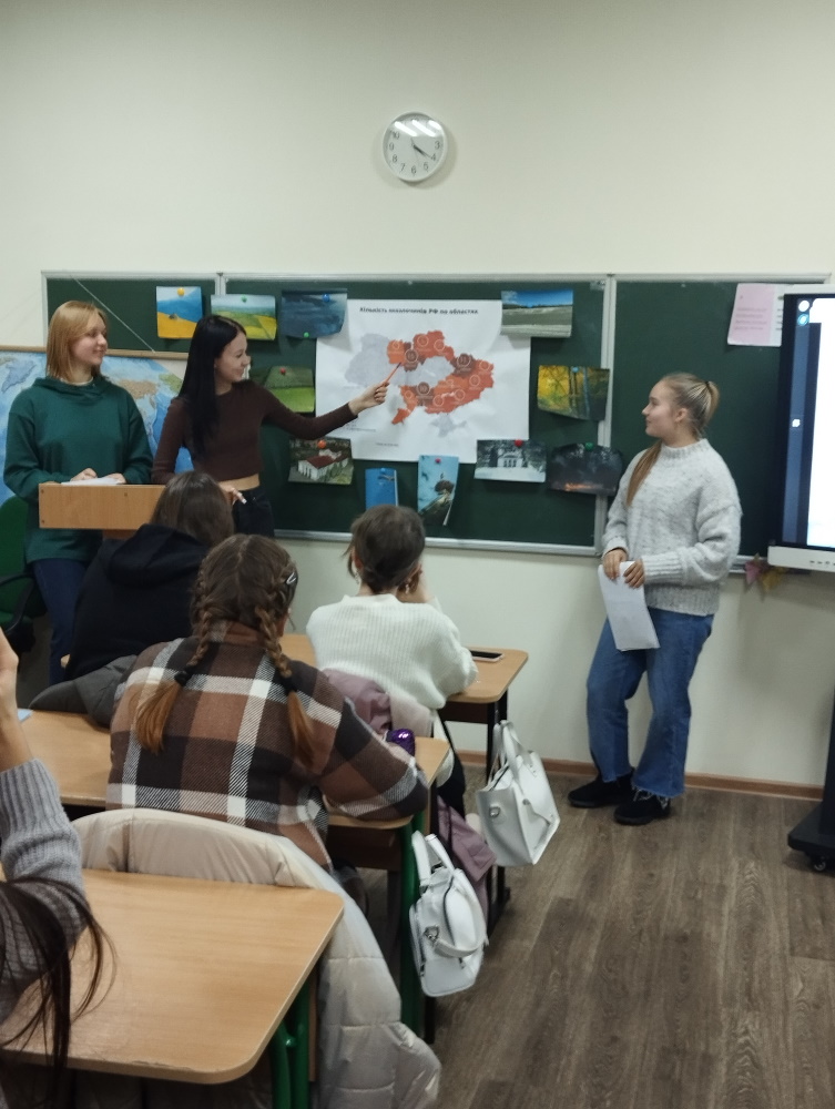 Студенти презентували свою дослідницьку роботу , в якій показали як військове вторгнення росії впливає на довкілля України: втрата біорізноманіття та загроза червонокнижним видам, пожежі в екосистемах через бойові дії, хімічне забруднення від обстрілів і ракет, забруднення ґрунтів та моря нафтопродуктами, пожежі на об’єктах промисловості та інфраструктури від обстрілів, ракетні атаки на підприємства та цивільні об’єкти, масштабні обстріли.