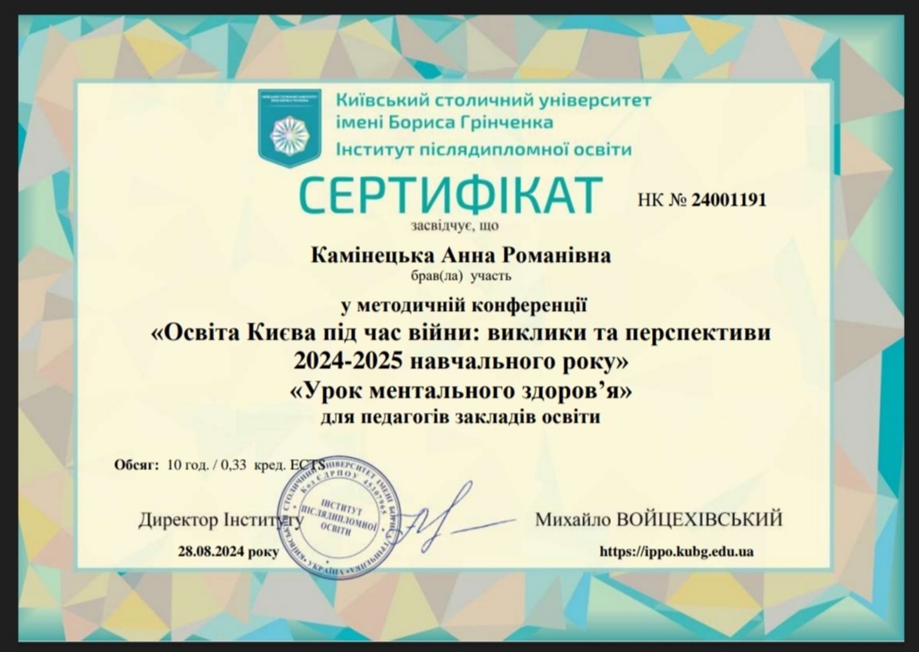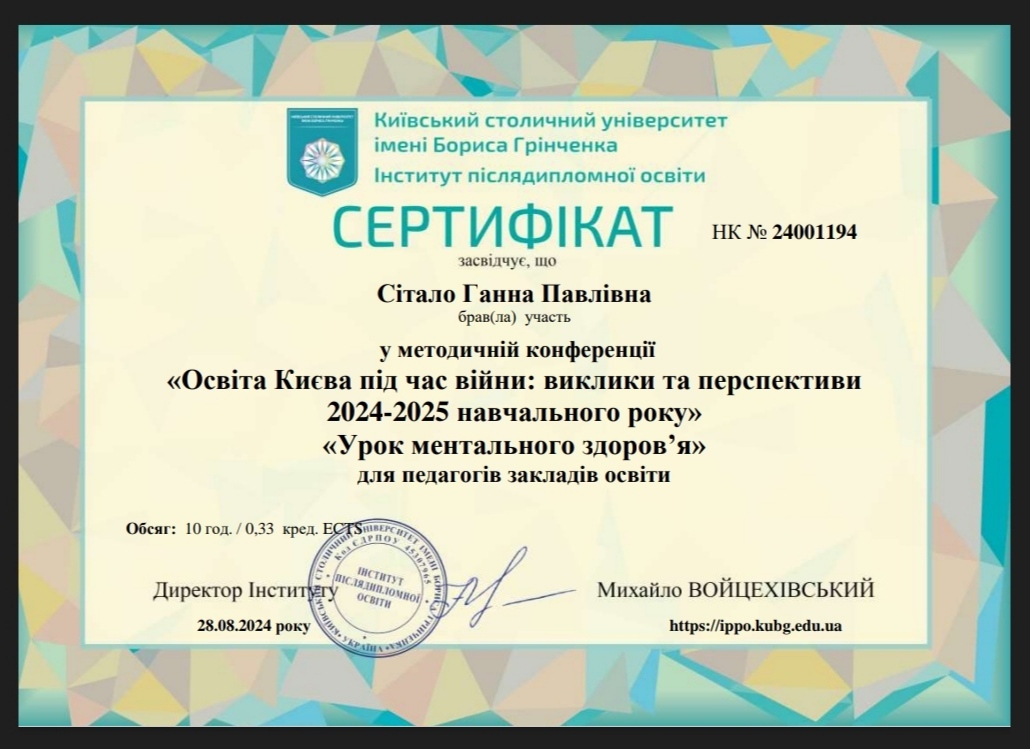 28.08.2024 р. в межах методичної конференції «Освіта Києва під час війни: виклики і перспективи 2024-2025 навчального року» відбувся семінар «Ментальне здоров`я», учасниками якого стали викладачі циклової комісії природничих дисциплін Фахового коледжу «Універсум» Київського столичного університету імені Бориса Грінченка: Кравченко Наталя Володимирівна, Камінецька Анна Романівна, Сітало Ганна Павлівна.
