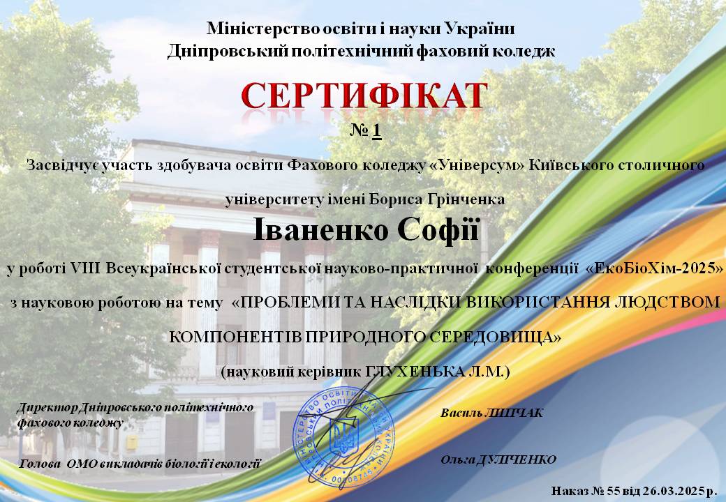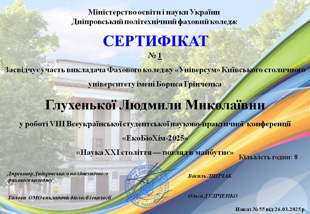 26.03.2025 року викладач ЦК природничих дисциплін Глухенька Л.М. разом зі студенткою спеціальності 013 Початкова освіта Іваненко Софією брали участь у VІІІ Всеукраїнській студентській науково-практичній конференції «ЕоБіоХім - 2025» «Наука ХХІстоліття- погляд в майбутнє» серед здобувачів освіти закладів фахової передвищої освіти, яка проходила на базі Дніпровського політехнічного фахового коледжу.