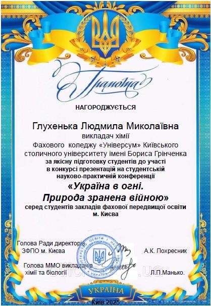 16.04.2025 року викладач ЦК природничих дисциплін Глухенька Л.М. разом зі студенткою спеціальності 013 Початкова освіта Петрович Євгенією брали участь у студентській науково-практичній конференції «Україна в огні. Природа зранена війною» з нагоди відзначення Дня екологічних знань (15 квітня) серед здобувачів освіти закладів фахової передвищої освіти, організованою Радою директорів, міським методичним об’єднанням викладачів хімії та біології.