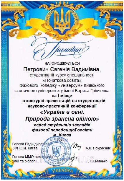Вітаємо Петрович Є. з І місцем конкурсі презентацій в номінації «Наслідки війни росії проти України для природи. (Екологія)».