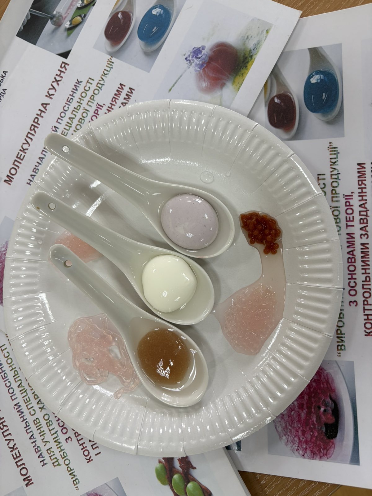 Студенти дізналися, як за допомогою альгінату натрію, кальцію та контролю концентрацій створюються кулінарні «сфери» — ніжні желеподібні кульки з рідким центром.