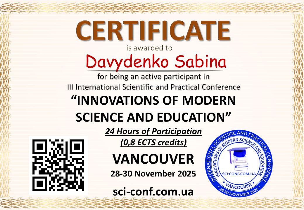 28-30.11.2025 року студентка 3 курсу спеціальності фізична культура Давиденко Сабіна та викладач циклової комісії природничих дисциплін Сітало Г.П. взяли участь у III Міжнародній науково-практичній конференції “INNOVATIONS OF MODERN SCIENCE AND EDUCATION, Ванкувер, Канада.
