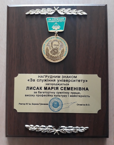 Щиро вітаємо Лисак Марію Семенівну викладача циклової комісії з педагогічної освіти Університетського коледжу Київського університету імені Бориса Грінченка із врученням нагрудного знаку «За служіння університету» за багаторічну сумлінну працю, високу професійну культуру і майстерність.