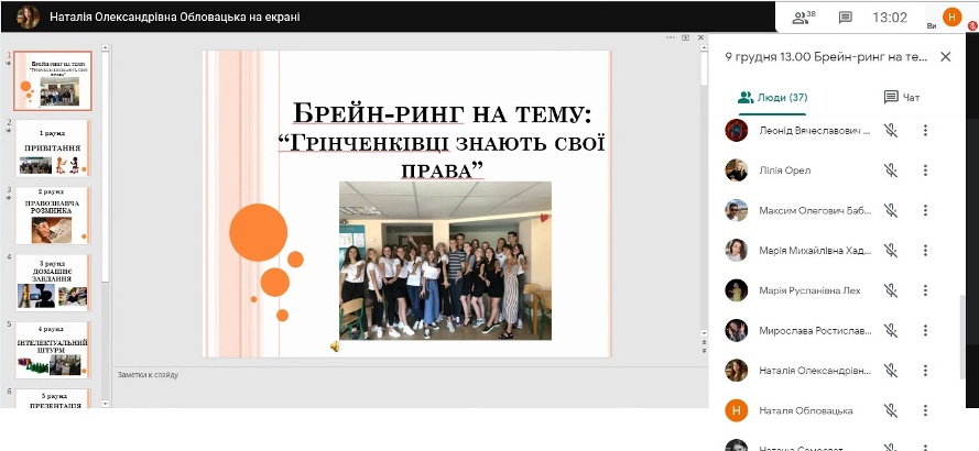 В рамках Грінченківської декади 9 грудня 2020 р. було проведено онлайн змагання, з використанням сервісу Google Meet,у пізнавально-інтелектуальній грі Брейн-ринг на тему: «Грінченківці знають свої права”. Захід був спрямований на перевірку знань студентів з основних прав студентів та людини.