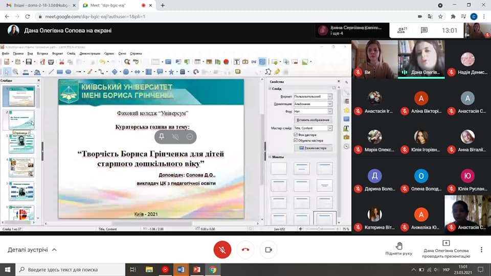 24.03.2021р. було проведено кураторську годину на тему “Творчість Бориса Грінченка для дітей старшого дошкільного віку” зі студентами групи ДОмс-2-18-3.Од. Як педагог, Б.Д. Грінченко розумів роль казки у дитячому вихованні. Його збірка "Книга казок віршем" мала велику популярність серед дітей, її не раз перевидавали. Борису Дмитровичу належить неостаннє місце серед байкарів. Всі байки написані за мотивами народних анекдотів і прислів'їв, або за цілком оригінальними сюжетами. Байкар підніс ідеї гуманізму, моральної гідності, скромності та людяності.