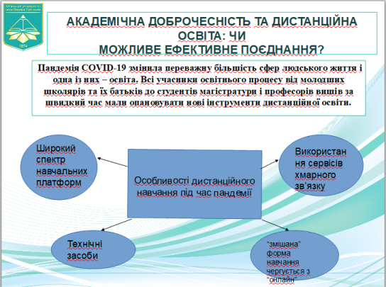 Під час заходу учасники обговорили стан дотримання етичних та юридичних норм академічної чесності в умовах дистанційного навчання, полемізували щодо ефективних механізмів запобігання та протидії академічної недоброчесності під час дистанційного навчання.