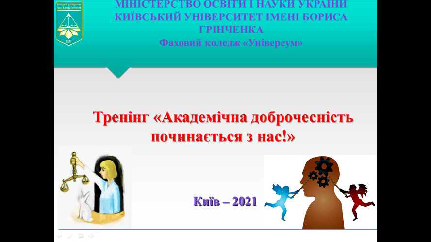 10.11.2021 р. викладач циклової комісії з педагогічної освіти, Д.О. Сопова провела тренінг на тему "Академічна доброчесність починається з нас!" для студентів спеціальностей "Математика" і "Комп’ютерні науки" за сприяння Факультету інформаційних технологій та управління. Під час тренінгу були розглянуті категорії "академічний плагіат" та "академічна доброчесність", "кодекс честі" у навчанні, різновиди плагіату; наголошено на позитивних причинах дотримуватися принципів академічної доброчесності. Студенти з інтересом вирішили тематичні кейси і долучилися до дискусії. Щиро дякуємо за запрошення!