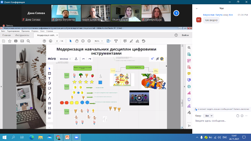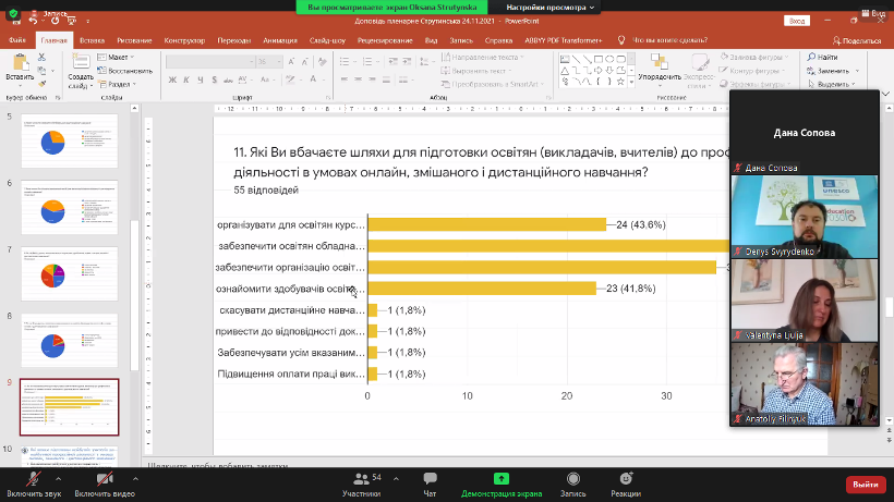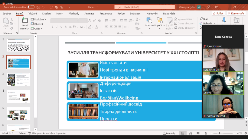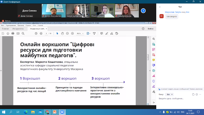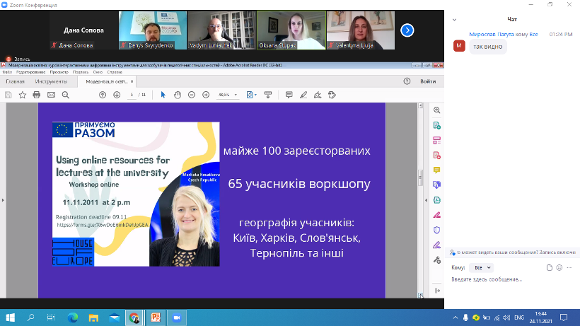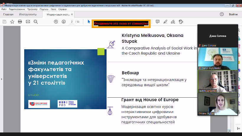24.11.2021 р. викладач циклової комісії з педагогічної освіти Д.О. Сопова брала участь в онлайн-конференції проєкту "Зміни педагогічних факультетів для ХХІ століття". Зі вступним словом виступив В. Лавриненко, проректор з міжнародних зв'язків Національного педагогічного університету імені М.П. Драгоманова. Ленка Гулова, спеціальна асистентка кафедри соціального педагогічного факультету Університету Масарика, головна координаторка проєкту виступила з доповіддю на тему "Куди прямуєш, університете?", де висвітлила головні переспективні вектори розвитку сучасних університетів. Головними темами конференції були: інтернаціоналізація вищої освіти, як виклик для України; дискусійні питання підготовки вчителів в умовах онлайн-навчання; можливості та виклики трансдисциплінарності. Щиро дякуємо за можливість участі в міжнародній конференції!