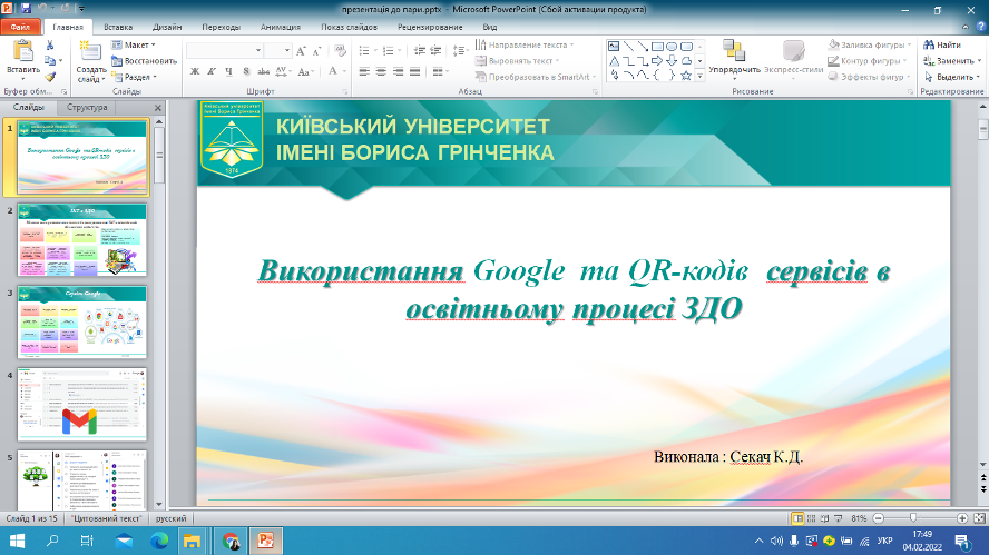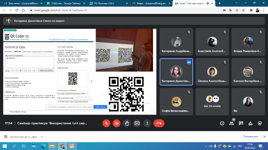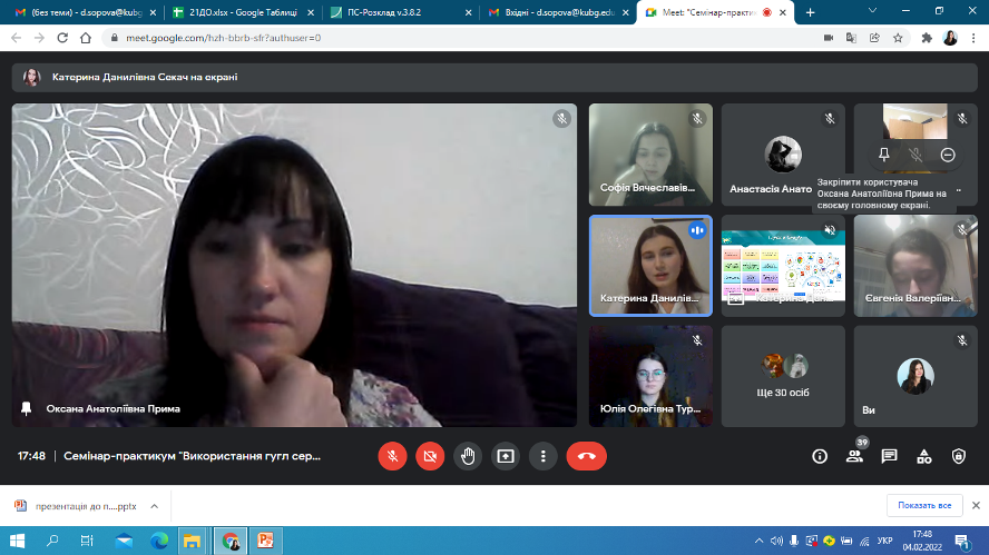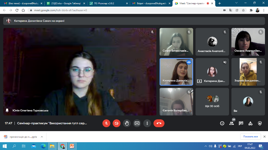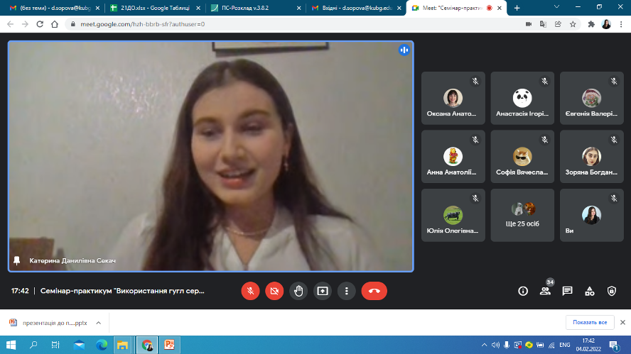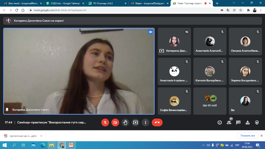4 лютого 2022 року відбулася онлайн-зустріч студентів другого курсу спеціальності 012 Дошкільна освіта із випускницею коледжу Катериною Данилівною Секач. Катерина Данилівна поділилася досвідом стосовно особливостей використання Google сервісів та QR-кодів в освітньому процесі закладу дошкільної освіти, виокремила найактуальніші способи використання ІКТ в методичній діяльності педагогів: створення електронної бази для накопичення ілюстративних матеріалів, заготовок для оформлення презентацій, буклетів, інформаційних стендів; розроблення презентацій до семінарів, конференцій, консультацій для вихователів, до засідань педагогічної ради, методоб’єднань; використання мультимедійного супроводу під час занять, проведення свят та розваг, режимних моментів, батьківських зборів та консультацій для батьків; оформлення результатів моніторингу рівня розвитку дитини старшого дошкільного віку за допомогою електронного варіанту кваліметричної моделі та ін. Щиро дякуємо Катерині Данилівні за інформативну та цікаву бесіду!