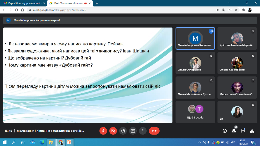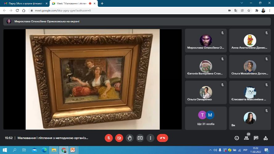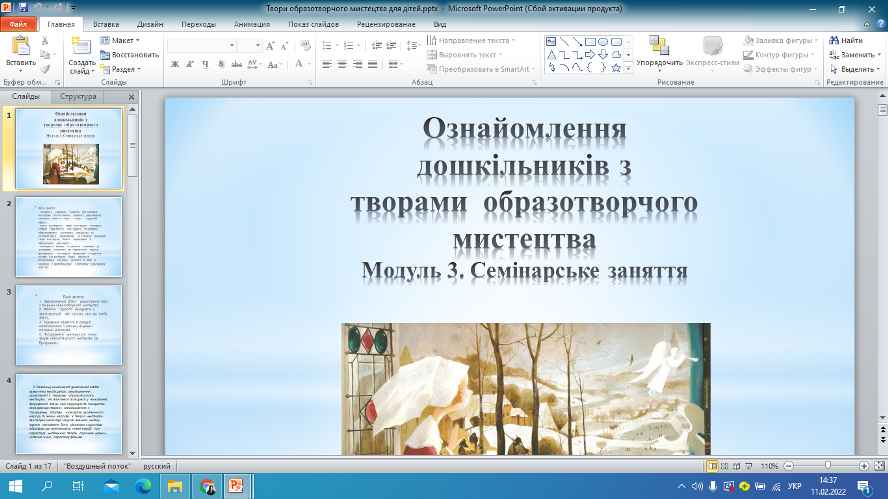 11.02.2022 р. було проведено онлайн-семінар "Ознайомлення дошкільників з творами образотворчого мистецтва" для студентів ІІ курсу спеціальності "012 Дошкільна освіта" та викладачів Фахового коледжу "Універсум". Під час онлайн-семінару було наголошено на важливій ролі дорослого у "зануренні" дитини в захоплюючу подорож у світ картин, скульптури, архітектури, народного мистецтва, яка сподобається дитині, викличе бажання до повторного огляду, стане прикладом високого мистецтва на все життя. У Базовому компоненті дошкільної освіти зазначено необхідність ознайомлення дітей передшкільного віку з творами образотворчого мистецтва, як важливої складової у вихованні, формуванні знань про природнє та предметне середовище. У творах мистецтва закладені необхідні наукові знання, митець здатен наповнити його цікавими художніми образами, що викликають певні емоції при перегляді мистецьких творів.