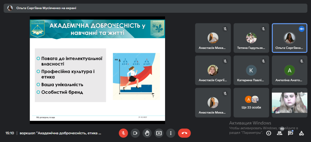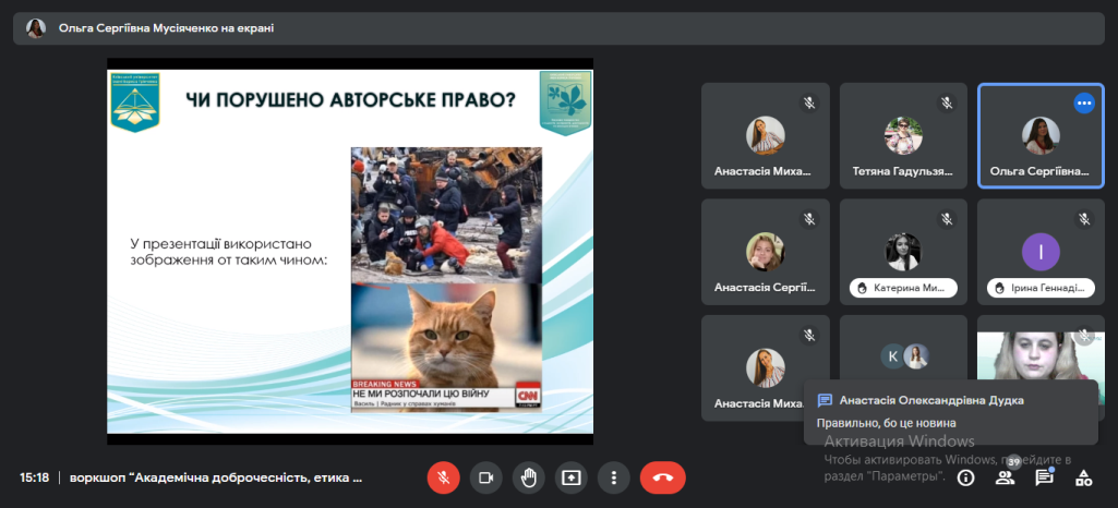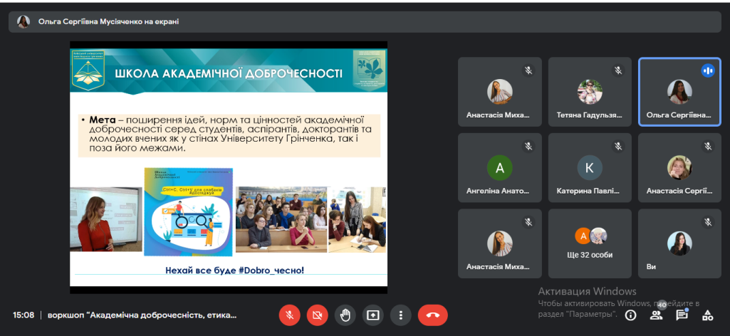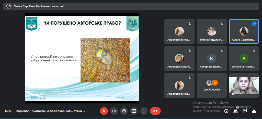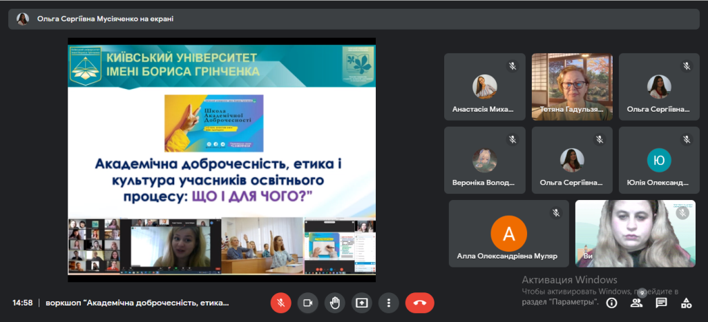 21.10.2022 р. було проведено воркшоп “Академічна доброчесність, етика і культура учасників освітнього процесу: що і для чого” для викладачів і студентів Факультету романо-германської філології Київського університету імені Бориса Грінченка. Учасники заходу обговорили загальні риси академічної доброчесності та етики дослідницької роботи; розглянули приклади порушень академічної доброчесності та їх наслідки; організатори заходу надали поради щодо того, як перевірити цитати на плагіат. Щиро дякуємо за запрошення!!!