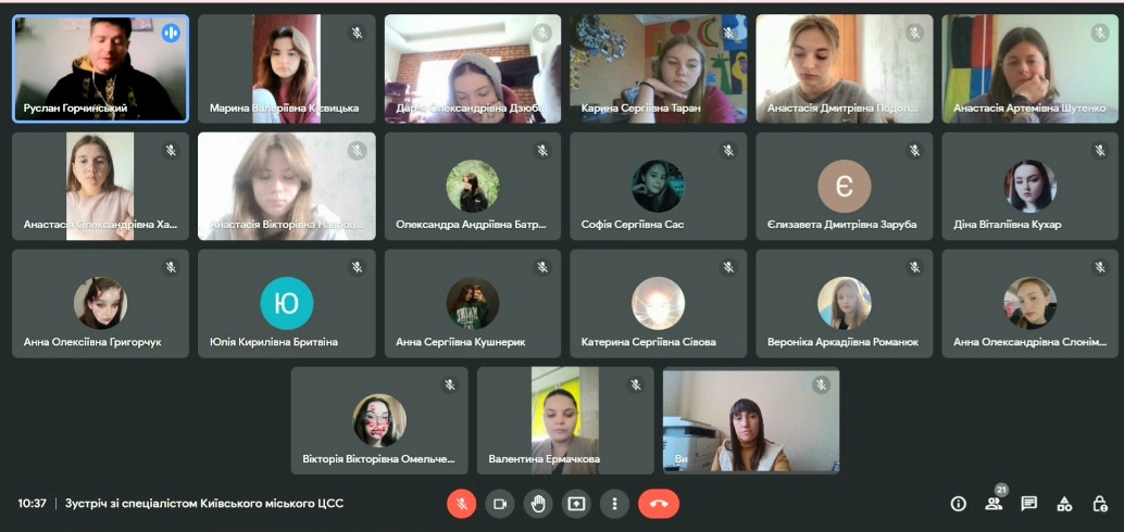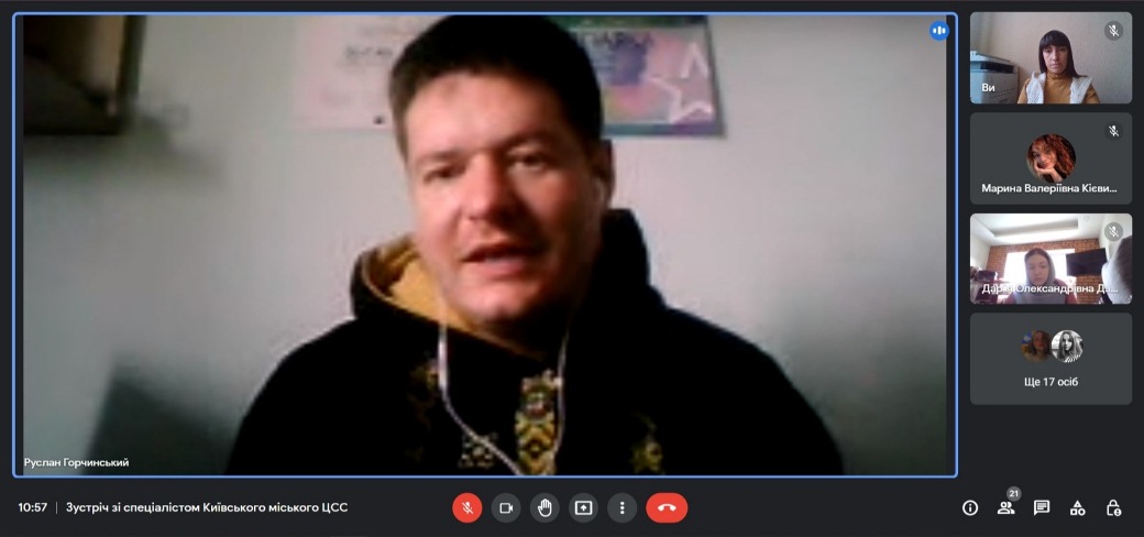 21 жовтня 2022 року зі студентами 2 курсу Фахового коледжу «Універсум» Київського університету імені Бориса Грінченка спеціальності Соціальна педагогіка, під час онлайн зустрічі, своїм професійним досвідом ділився фахівець із соціальної роботи Руслан ГОРЧИНСЬКИЙ. Зустріч була організована за сприяння спеціаліста Київського міського центру соціальних служб Валентини Єрмачкової.