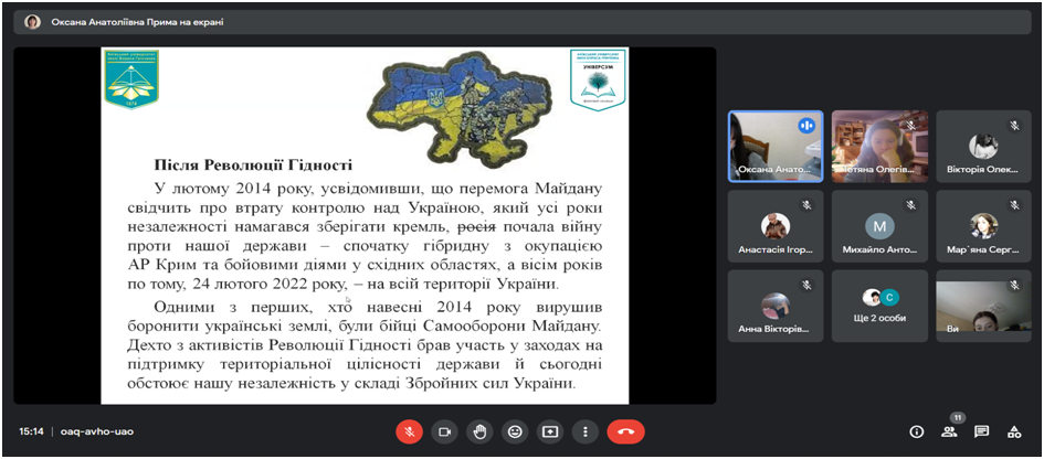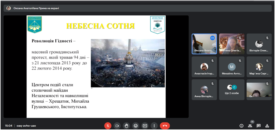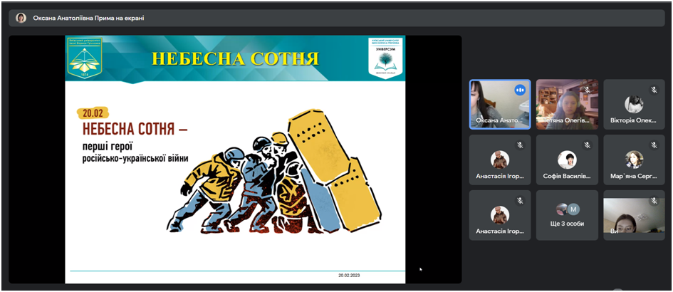 20 лютого 2023 року зі студентами ІІ та ІІІ курсів Фахового коледжу «Універсум» Київського університету імені Бориса Грінченка спеціальності «Соціальна педагогіка» були проведені онлайн зустрічі до Дня Героїв Небесної Сотні.