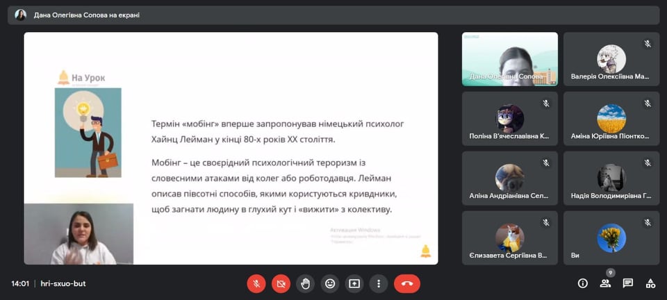 Мета семінару-практикуму: ознайомити учасників з поняттям "мобінг", впливом цього явища на особистість і колектив в цілому, опрацювати практичні методи виявлення постраждалих та агресорів, розглянути методи профілактики та втручання. Учасники заходу вирішили тематичні кейси та долучились до дискусії, поділились своїм досвідом.