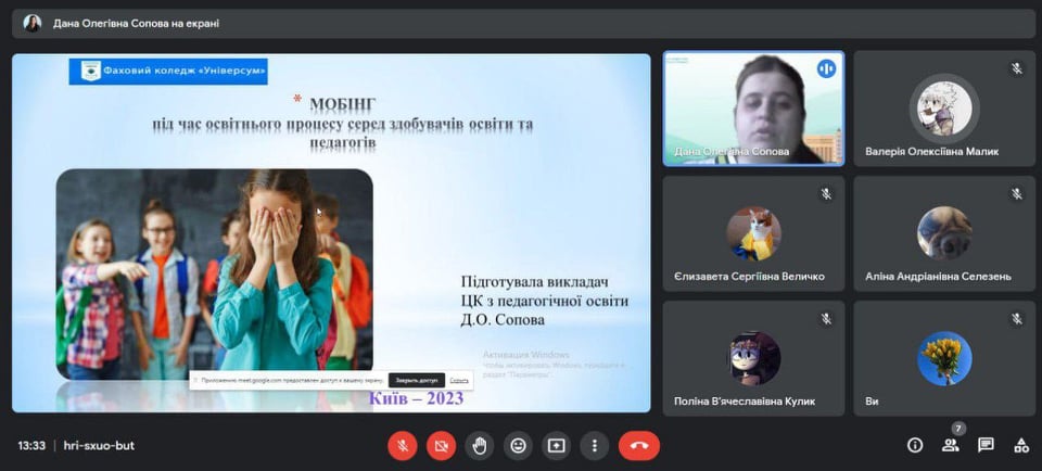 14.03.2023р. було проведено семінар-практикум "Мобінг під час освітнього процесу серед здобувачів освіти та педагогів" для студентів групи СПмс-1-19-4.Од та викладачів Фахового коледжу "Універсум".