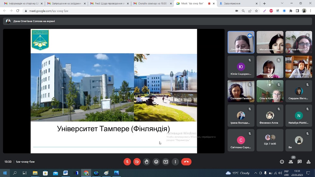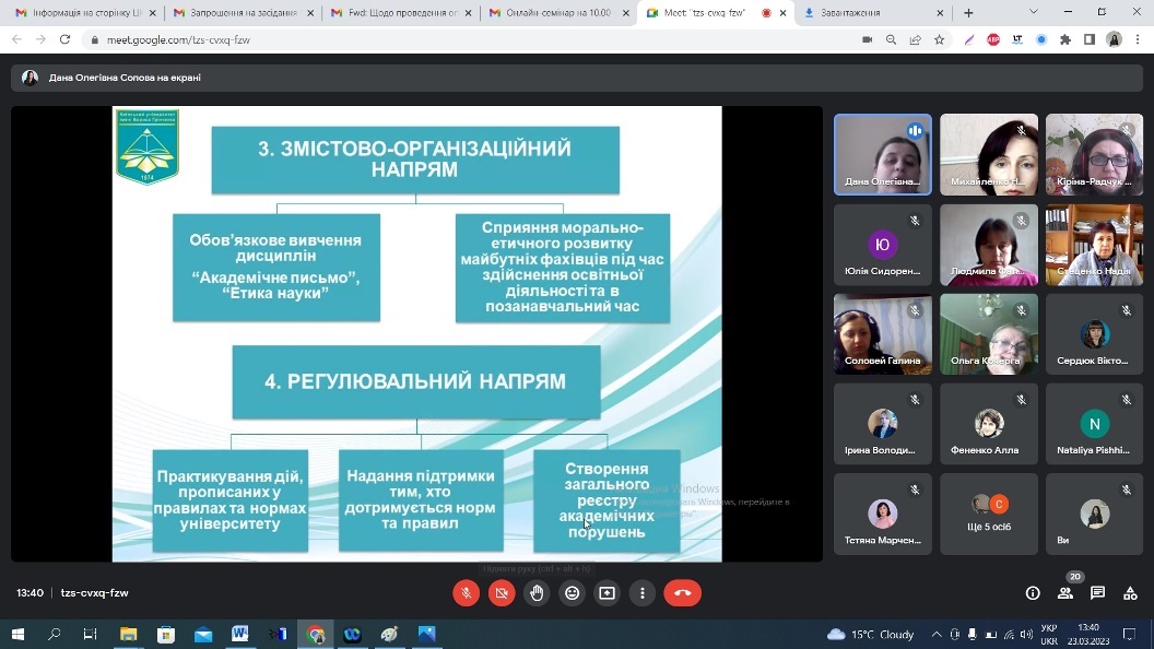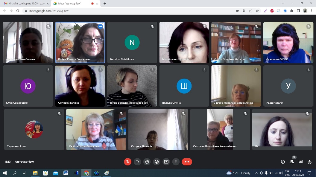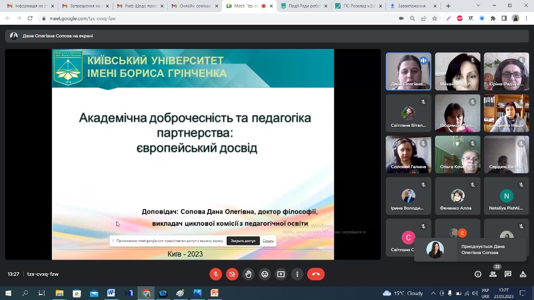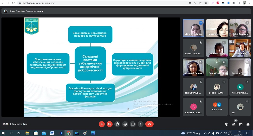 23.03.2023 р. викладачі циклової комісії з педагогічної освіти Альона Олександрівна Доценко та Дана Олегівна Сопова взяли участь в онлайн-семінарі "Педагогіка партнерства в освітньому просторі фахового педагогічного коледжу", який відбувся у рамках роботи методичного об'єднання голів циклових комісій психолого-педагогічних дисциплін педагогічних ЗФПО Центрального регіону України. Д.О. Сопова виступила з доповіддю на тему "Академічна доброчесність та педагогіка партнерства: європейський досвід". Було зроблено акцент на тому, що педагогіка партнерства неможлива без довіри всіх учасниць та учасників освітнього процесу одне до одного. А доброчесність - основа довіри. Якщо людина доброчесна, то ти можеш ïй довіряти, і сам маєш бути вартим її довіри. Щиро дякуємо організаторам, Комунальний закладу Сумської обласної ради "Лебединський педагогічний фаховий коледж імені А.С. Макаренка", за можливість долучитися до наукового заходу!