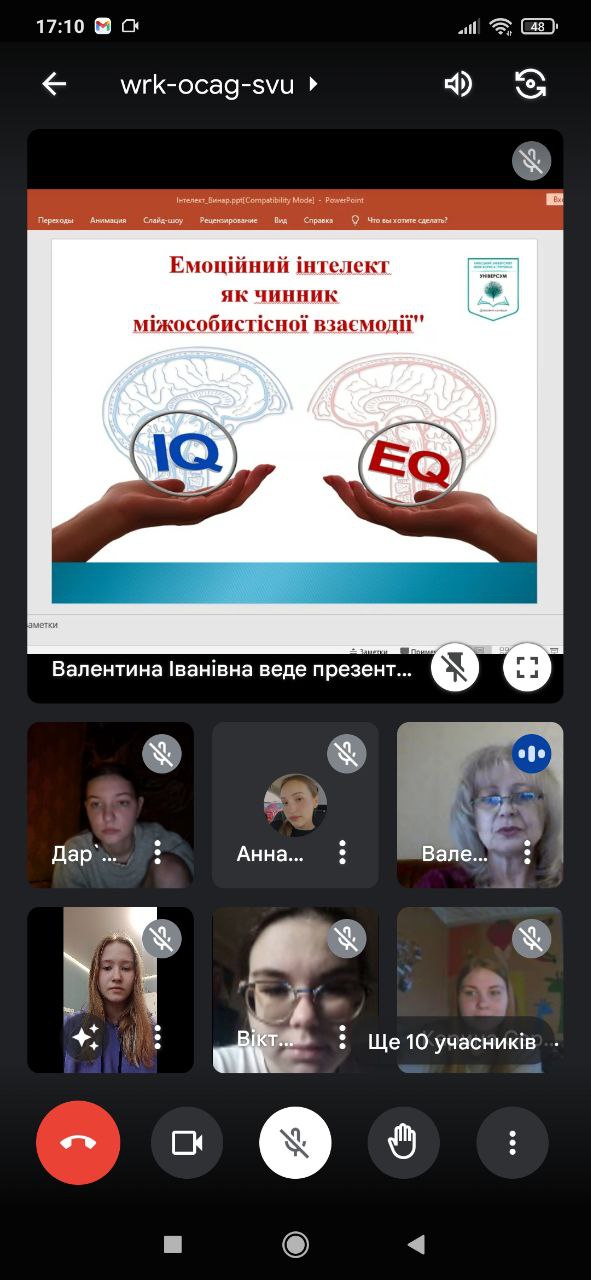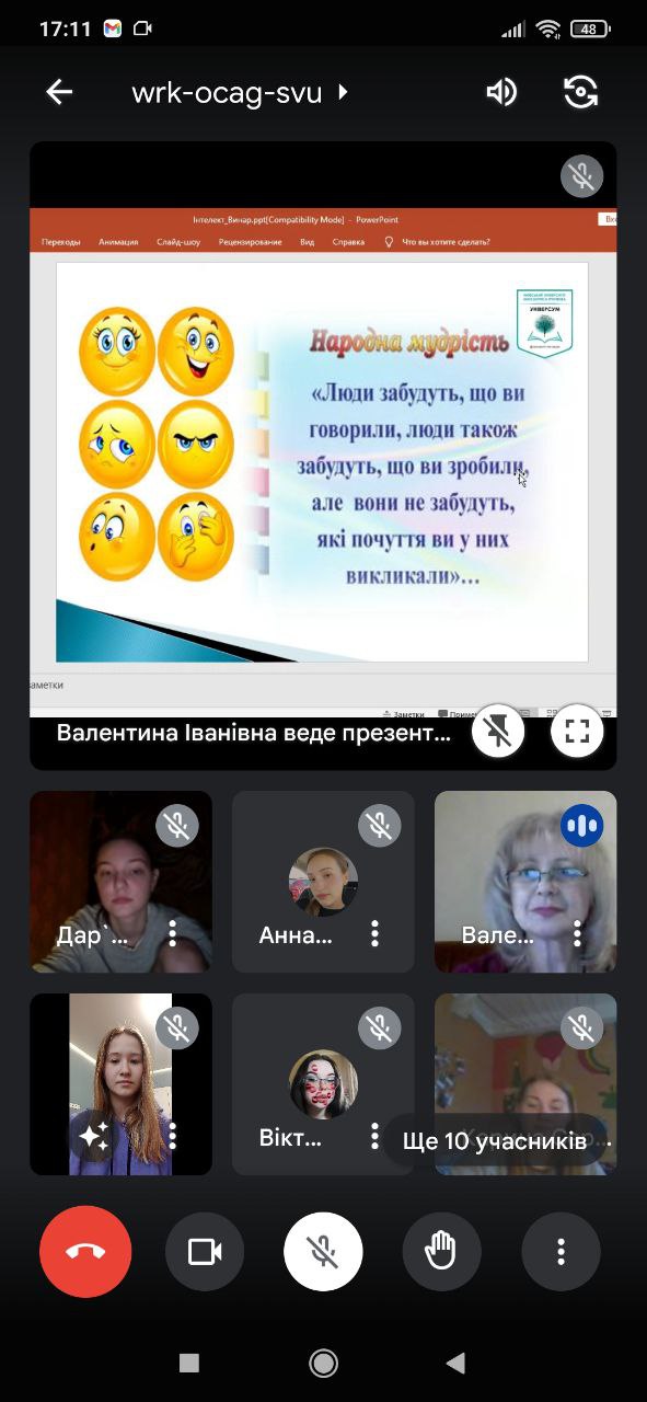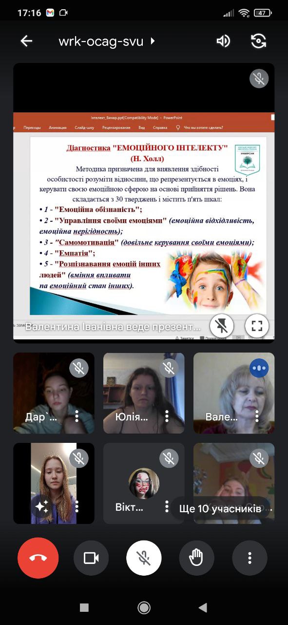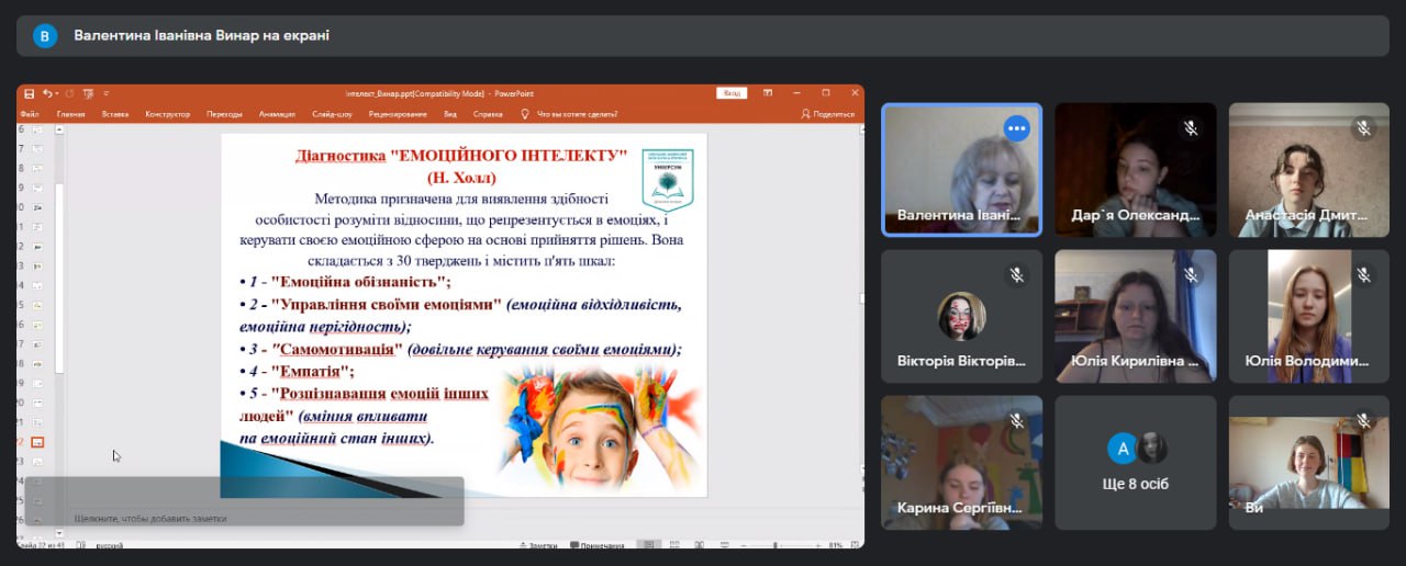 Учасники воркшопу розширили свої знання про поняття емоційного інтелекту та визначили його рівень за допомогою методики Н. Холла, дослідили емоційні бар’єри спілкування, а також презентували техніки розвитку емоційного інтелекту в умовах сьогодення. Заняття пройшло цікаво, інформативно, в творчій та доброзичливій атмосфері співпраці.