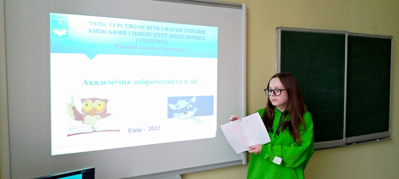14.04.2023 р. в рамках Декади циклової комісії з педагогічної освіти та з нагоди відзначення Дня коледжу було проведено воркшоп “Академічна доброчесність в дії” для викладачів і студентів Фахового коледжу "Універсум". Учасники заходу обговорили загальні риси академічної доброчесності та етики дослідницької роботи; розглянули приклади порушень академічної доброчесності та їх наслідки; студентам були надані поради щодо того, як перевірити цитати на плагіат. Також студенти представили своє бачення дотримання принципів академічної доброчесності в освітньому процесі.