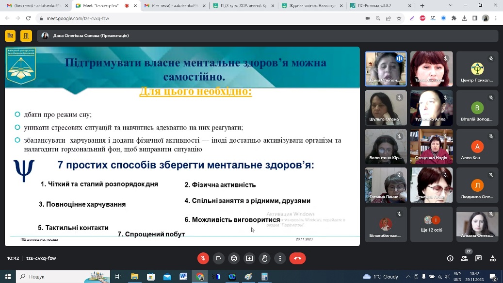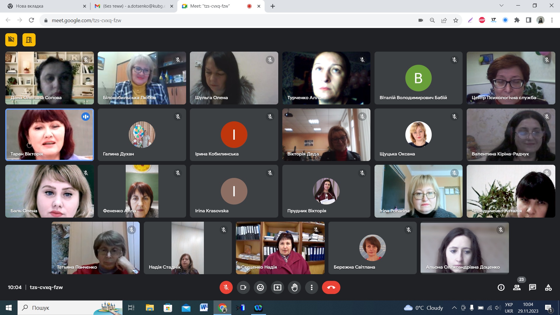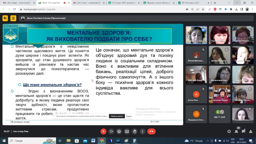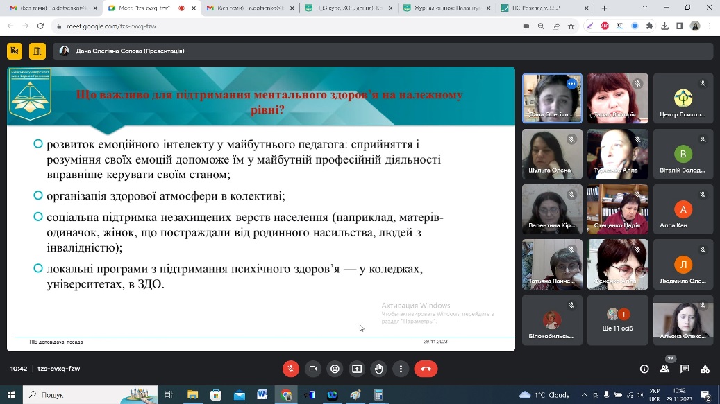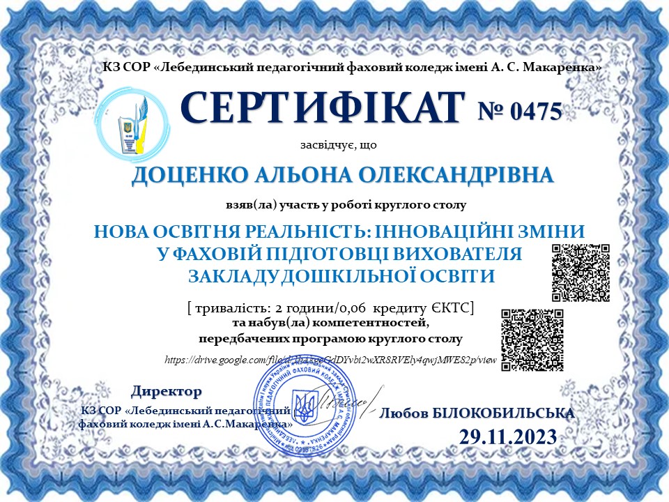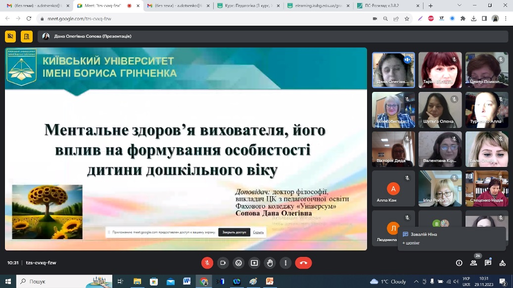 29 листопада 2023 року Доценко А.О., Сопова Д.О. та Матюшинець Я.В., викладачі циклової комісії з педагогічної освіти долучилися до онлайн-засідання круглого столу «Нова освітня реальність: інноваційні зміни у фаховій підготовці вихователя закладу дошкільної освіти», який відбувся на базі Комунального закладу Сумської обласної ради «Лебединський педагогічний фаховий коледж імені А.С. Макаренка». До участі були запрошені викладачі дошкільної педагогіки та окремих методик педагогічних ЗФПО Центрального регіону України. Сопова Д.О. виступила з доповіддю на тему «Ментальне здоров’я вихователя, його вплив на формування особистості дитини дошкільного віку». Щиро дякуємо організаторам заходу за можливість поділитися своїми здобутками з науковою спільнотою!