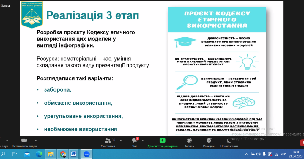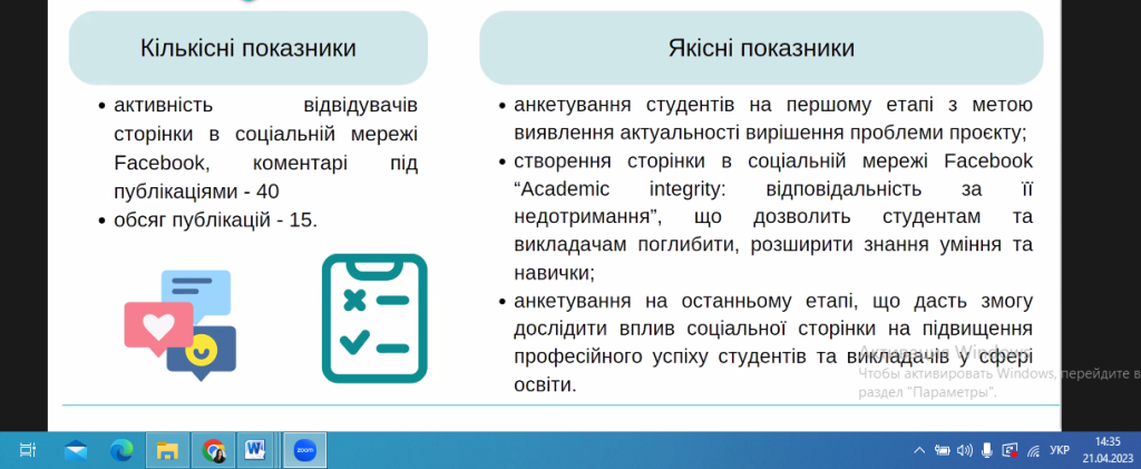 21 квітня 2023 року було проведено вебінар «Шляхи популяризації академічної доброчесності серед здобувачів фахової перед вищої освіти» для студентів та викладачів Фахового коледжу «Універсум». Захід був спрямований на вивчення стратегій та методів підвищення рівня етичності в академічному середовищі. Учасники дізналися, як створити стимулюючу атмосферу для дотримання етичних норм та уникнення плагіату. В рамках вебінару було розглянуто практичні приклади та кейси, а також висвітлені інструменти, які сприяють формуванню культури академічної доброчесності. Учасники отримали корисні поради щодо виявлення та запобігання порушенням етичних стандартів в галузі фахової перед вищої освіти.