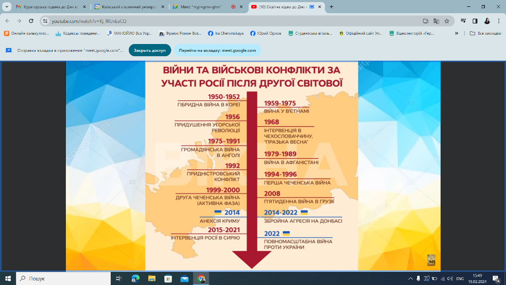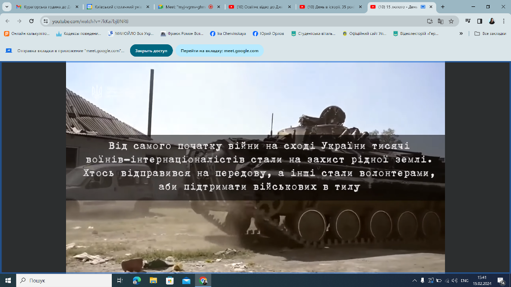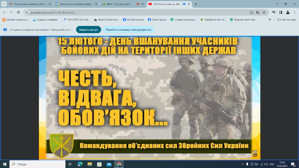 15 лютого 2024 року було проведено кураторську годину до Дня вшанування учасників бойових дій на території інших держав для студентів групи ДОфмб-1-21-3.0д.