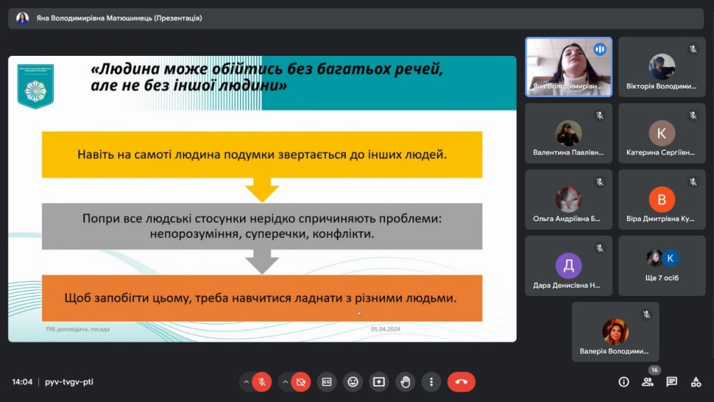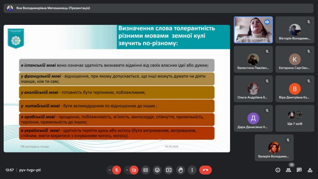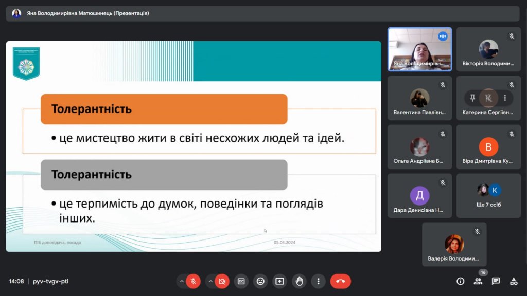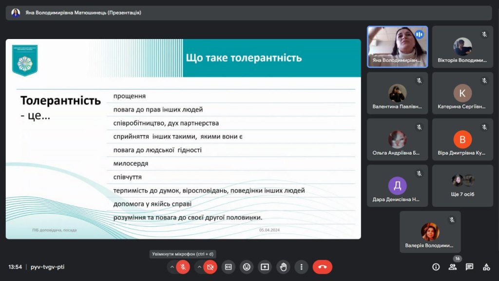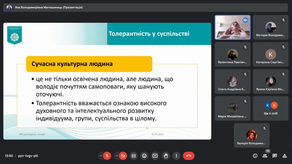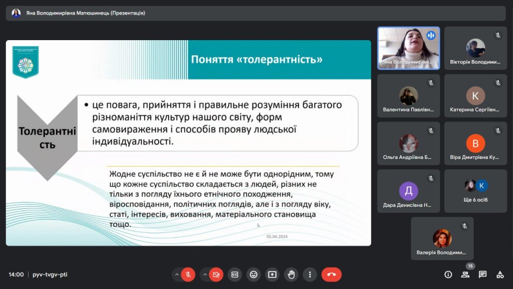 Мета заходу – сприяти усвідомленню студентами сутності поняття «толерантність», виявити основні риси толерантності, розширити уявлення студентів про толерантну поведінку та необхідність толерантного ставлення до оточуючих у різних життєвих ситуаціях, розвивати здатність до емпатії та вміння вирішувати конфлікти мирним шляхом і знаходити компроміс. Під час заходу учасники вебінару мали змогу ознайомитись з поняттям «толерантність» та його ознаками, особливостями прояву толерантності, терпимості, розуміння індивідуальності кожної особистості та почуття відповідальності за свої вчинки.