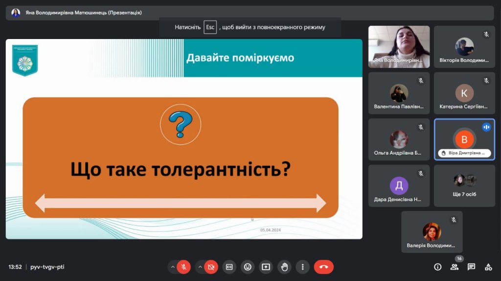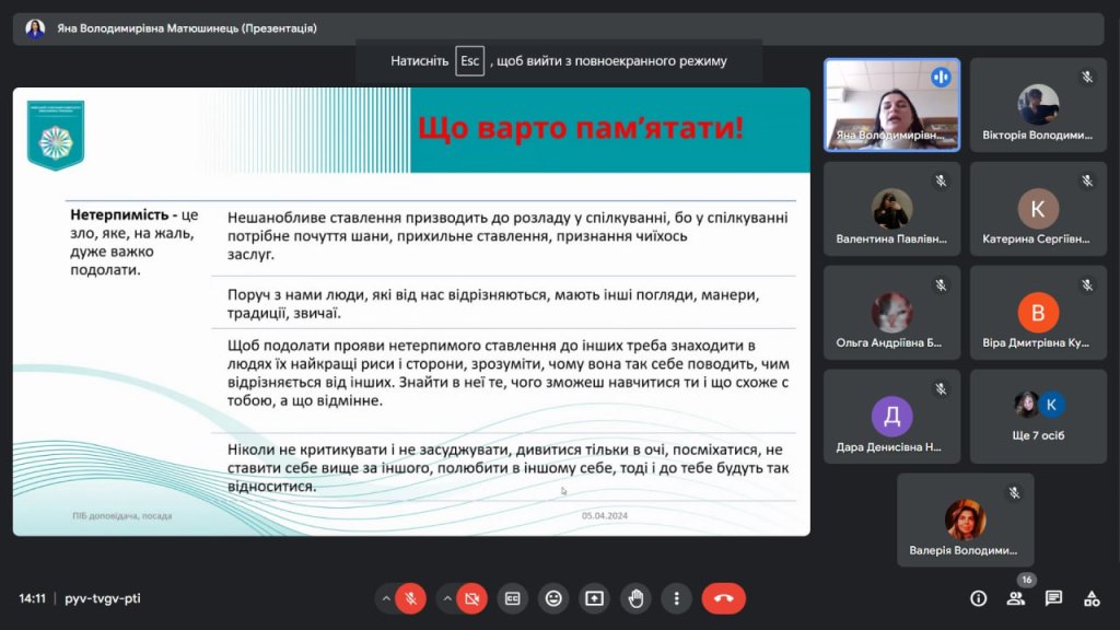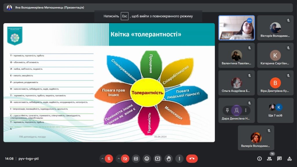 05 квітня 2024 року з нагоди декади циклової комісії з педагогічної освіти для студентів 3 курсу спеціальності 012 «Дошкільна освіта» Фахового коледжу «Універсум» Київського столичного університету імені Бориса Грінченка було проведено онлайн-тренінг «Толерантність як запорука успішної професійної діяльності педагога».