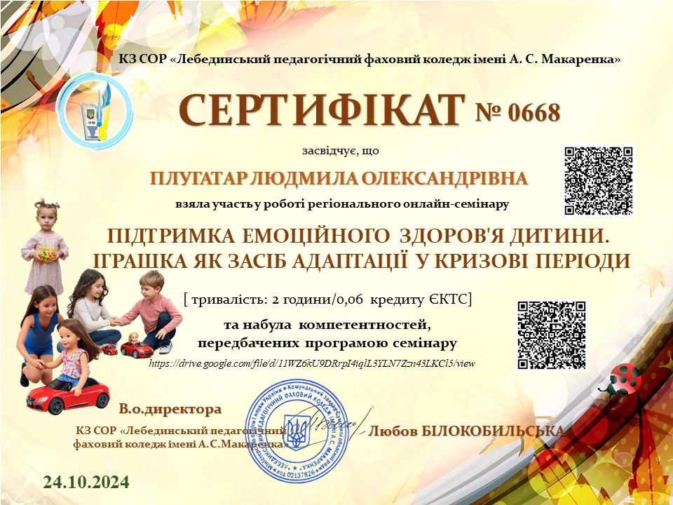 24.10.2024 року викладачі циклових комісій з педагогічної освіти, економіко-математичних дисциплін і менеджменту та студенти 3-го курсу спеціальності «Дошкільна освіта» Фахового коледжу «Універсум» Київського столичного університету імені Бориса Грінченка долучилися до роботи регіонального онлайн-семінару «Підтримка емоційного здоров'я дитини. Іграшка як засіб адаптації у кризові періоди», що проводився на базі Лебединського педагогічного коледжу імені А.С. Макаренка КЗ Сумської обласної ради.