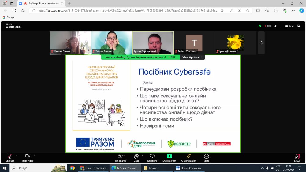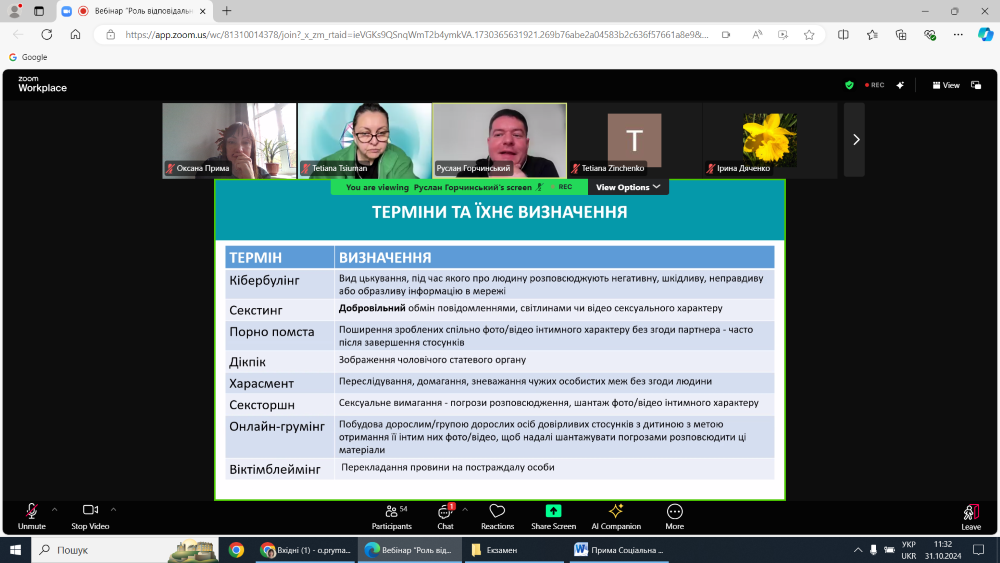 Під час вебінару учасників ознайомили із видами та проявами сексуального онлайн-насильства, разом відпрацьовували алгоритми реагування на випадки сексуального онлайн-насильства та сформулювали основні завдання відповідального дорослого як за напрямом попередження, так і за напрямом протидії онлайн-насильству.