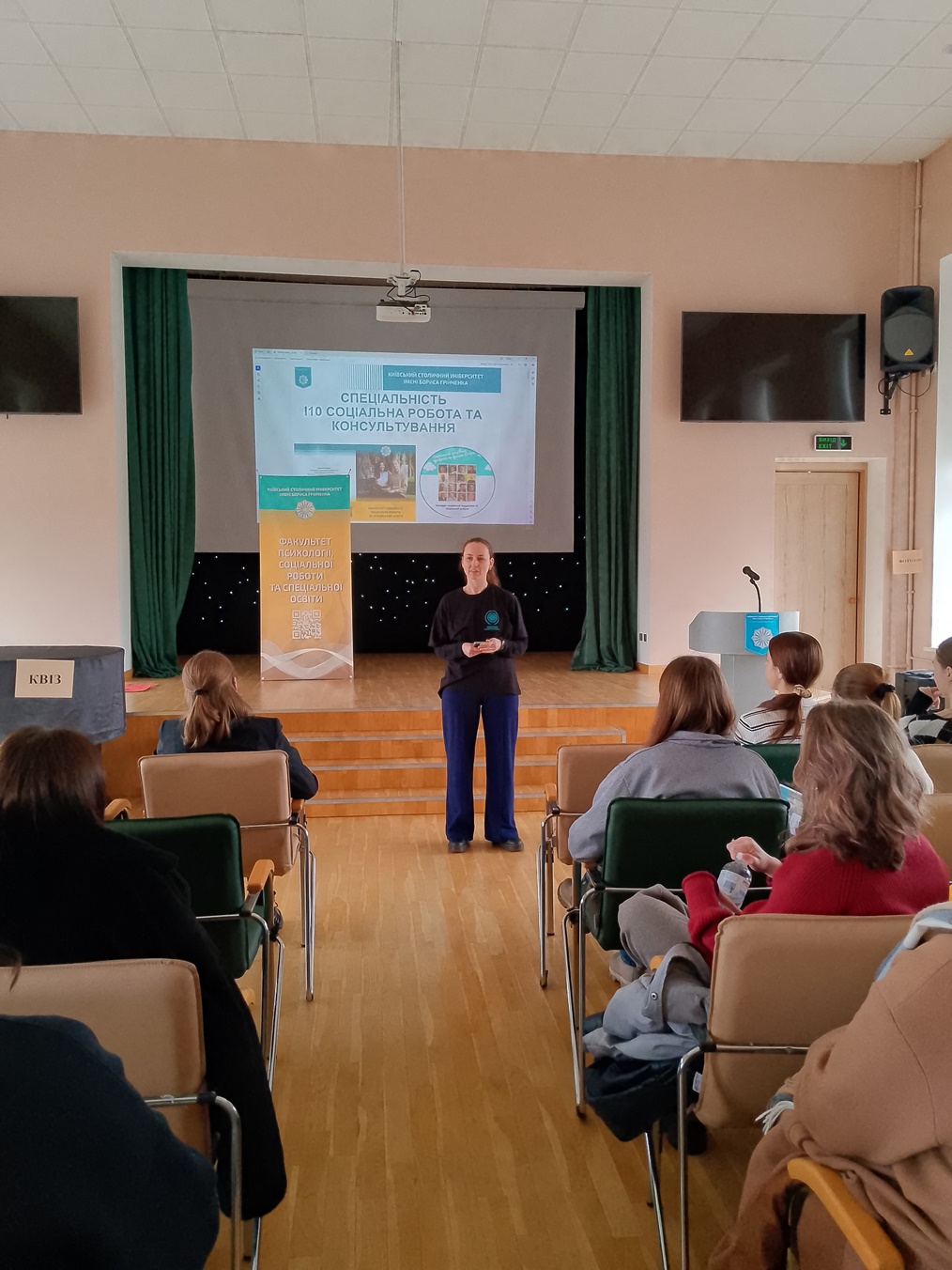 10 квітня 2025 року відбувся профорієнтаційний захід для здобувачів Фахового коледжу "Універсум", груп ПОфмб-1-21-4.Од, СПфмб-1-21-4.Од, СПфмб-1-22-3.Од. Викладачі Кафедри соціальної педагогіки та соціальної роботи Університету Грінченка КОТЕЛЕВЕЦЬ Анастасія, МАРТИНЮК Яна разом зі студентами ІІ курсу освітніх програм «Соціальна робота» (CРб-1-23-4.0д) та «Соціальна адвокація» (CАб-1-23-4.0д) презентували програми кафедри та провели профорієнтаційний квест «Соціальна робота - професія майбутнього». Під час квесту здобувачі мали змогу ознайомитися з різними локаціями (Міфи та факти, Квіз, Криничка, Фотозона, Пазли), на кожній із локацій завдання були спрямовані на знайомство зі студентським життям та спеціальністю "Соціальна робота та консультування". Тема проведеного заходу відповідає цілі сталого розвитку № 17 "Партнерство заради сталого розвитку".