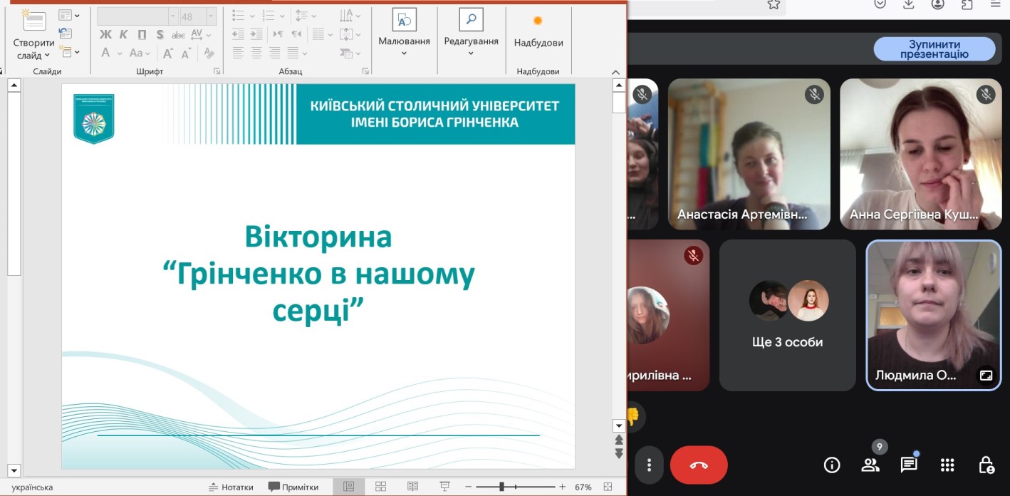 6 травня 2025 року зі студентами четвертого курсу спеціальності «Соціальна робота» Фахового коледжу «Універсум» Київського столичного університету імені Бориса Грінченка була проведена вікторина «Грінченко в нашому серці».