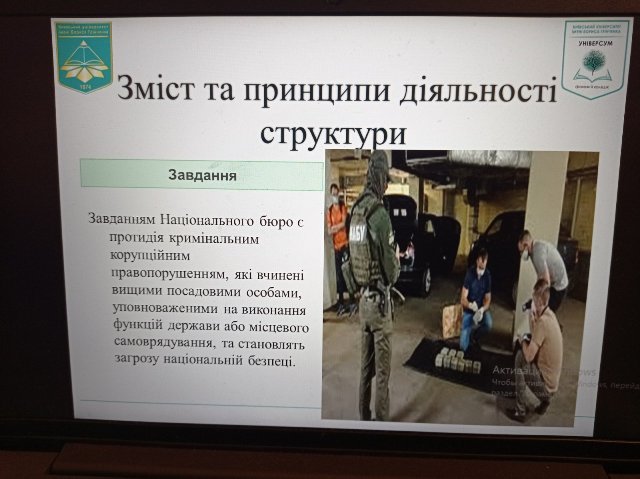 Майбутні юристи ознайомилися зі змістом,  структурою, принципами діяльності Національного антикорупційного бюро України. Переконались в важливості  ролі цього правоохоронного органу в становленні України як правової демократичної держави та рівноправного члена європейської спільноти.