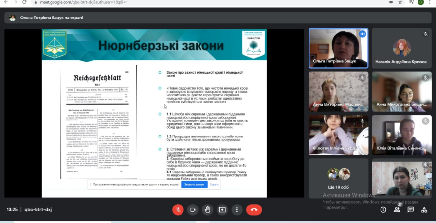 Студенти, переглянувши фото та відеодокументи, ознайомились з історією та сутністю Голокосту в Україні через призму трагедії Бабиного Яру, де 80 років тому відбулись масові розстріли євреїв та представників інших національностей та з тим, що Голокост завжди буде слугувати всьому людству пересторогою про небезпеки, які приховують у собі ненависть, фанатизм, расизм, упередження.