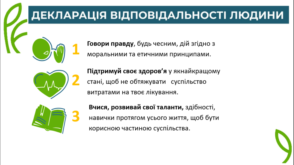Студенти були ознайомлені з постаттю видатного українця , автора "Декларації відповідальності людини" Богдана Гаврилишина , ознайомившись зі змістом декларації, визначили актуальність особистої і громадянської відповідальності перед суспільством, громадою, державою, пращурами та нащадками