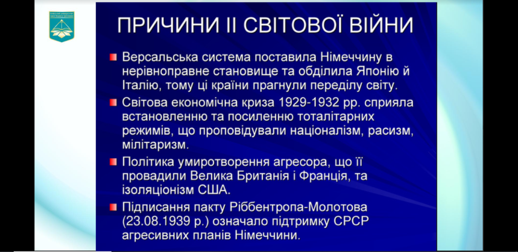 21 листопада 2022 року в Фаховому коледжі "Універсум" в рамках декади циклової комісії суспільних дисциплін і правознавства викладач циклової комісії Казаков Олександр Олексійович провів відкрите заняття в групі ВСфмб-1-22-4.0д. на тему: "Причини, характер, періодизація Другої світової війни".
