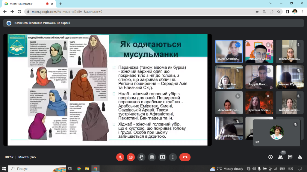 22 березня 2023 року в Фаховому коледжі "Універсум" Київського університету імені Бориса Грінченка в групі 1 курсу спеціальності "Право" викладач циклової комісії суспільних дисциплін і правознавства Рябоконь Юлія Станіславівна провела відкрите заняття з дисципліни "Мистецтво" на тему: "Мистецтво арабо-мусульманського культурного регіону".