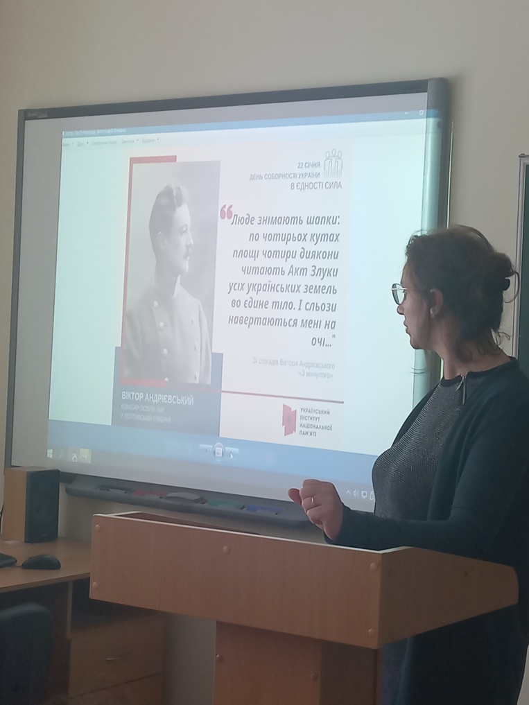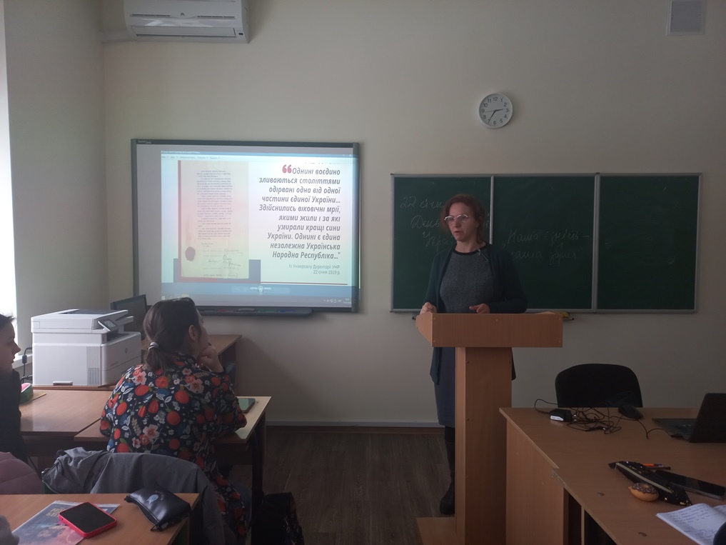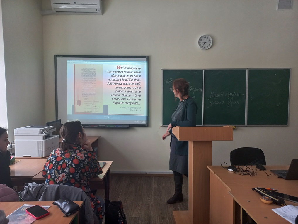 Під час лекторію студенти пригадали події Української національно-демократичної революції 1917-1921 років та особливу увагу звернули на те, що саме проголошення незалежності УНР в 1918 році та об’єднання УНР та ЗУНР в єдину соборну державу увінчало прагнення українців, розділених імперіями до єднання та створення власної незалежної соборної держави. Під час доленосних історичних подій сила нації завжди в її єдності. Пам’ятаємо, що наша єдність – це наша зброя! Слава Україні!